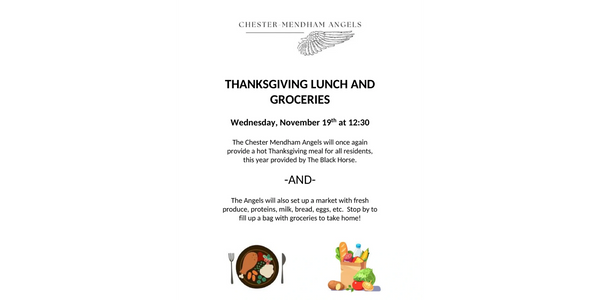 The Chester Mendham Angels will once again provide a full Thanksgiving lunch to all of our residents. Come enjoy lunch with your neighbors in the community room or have it delivered to your door. The Angels will set up a "market" with fresh produce, proteins, milk, eggs, bread, etc. where residents can fill a bag to take home! Thank you Angels! You are amazing!